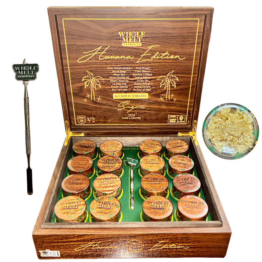 Whole Melt Exotic Limited Edition “Havana” Live Resin Sugar in a 1g jar, a premium concentrate crafted for cannabis connoisseurs seeking unmatched flavor and potency. This limited-edition live resin features 16 exotic strains, capturing the essence of the Havana strain alongside a diverse array of rich terpene profiles.